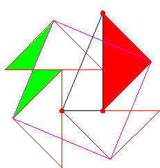 As a last step, we rotate the triangles 90°, each around its top vertex. The right one is rotated clockwise whereas the left triangle is rotated counterclockwise. Obviously the resulting shape is a square with the side c and area c². This proof appears in a dynamic incarnation.