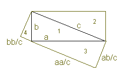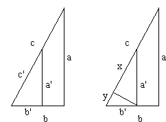 We start with the original right triangle, now denoted ABC, and need only one additional construct - the altitude AD. The triangles ABC, DBA, and DAC are similar which leads to two ratios: