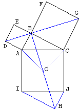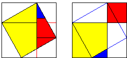 (A variant of this proof is found in an extant manuscript by Thâbit ibn Qurra located in the library of Aya Sofya Musium in Turkey, registered under the number 4832. [R. Shloming, Thâbit ibn Qurra and the Pythagorean Theorem, Mathematics Teacher 63 (Oct., 1970), 519-528]. ibn Qurra's diagram is similar to that in proof #27. The proof itself starts with noting the presence of four equal right triangles surrounding a strangely looking shape as in the current proof #2. These four triangles correspond in pairs to the starting and ending positions of the rotated triangles in the current proof. This same configuration could be observed in a proof by tessellation.)