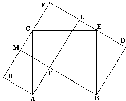 ΔABF has base AF and the altitude from B equal to AC. Its area therefore equals half that of square on the side AC. On the other hand, ΔAEC has AE and the altitude from C equal to AM, where M is the point of intersection of AB with the line CL parallel to AE. Thus the area of ΔAEC equals half that of the rectangle AELM. Which says that the area AC² of the square on side AC equals the area of the rectangle AELM.